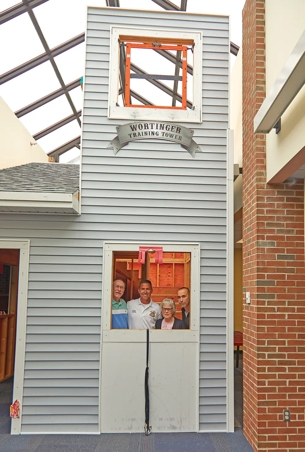 Members of the Wortinger family pose for a photo with instructor Travis Peak in the Wortinger Training Tower at the Redhawk Fire Academy.